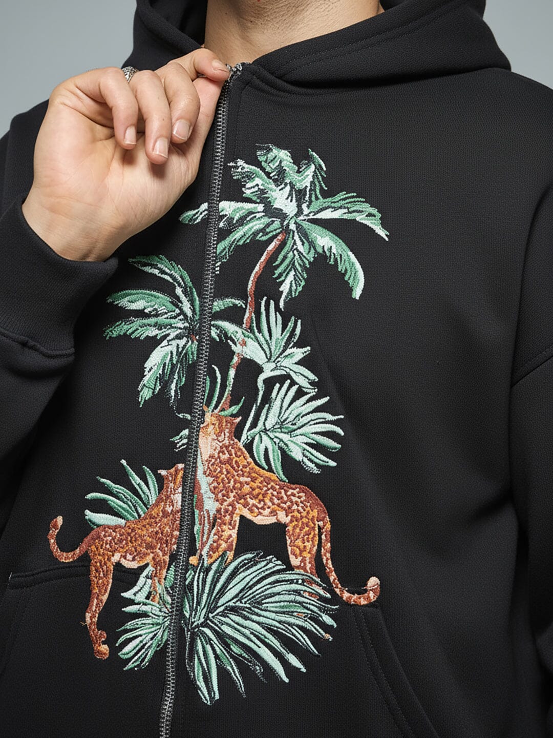 Black Tropical Tiger Embroidered Hoodie