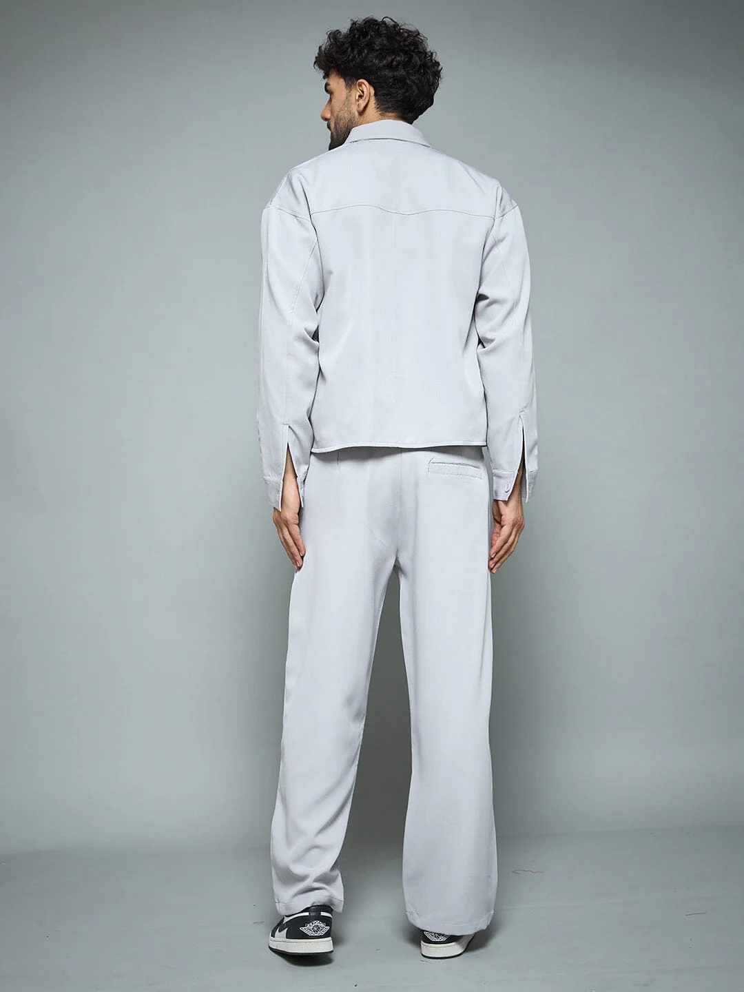 The Silver Grey Korean Clothing Set features a soft, premium blend fabric with a straight relaxed fit. It includes a zip fly, button closure, side pockets, and front pleats. The coordinated shacket and trousers have a spread collar and waistband with belt loops, perfect for layering and warmth.