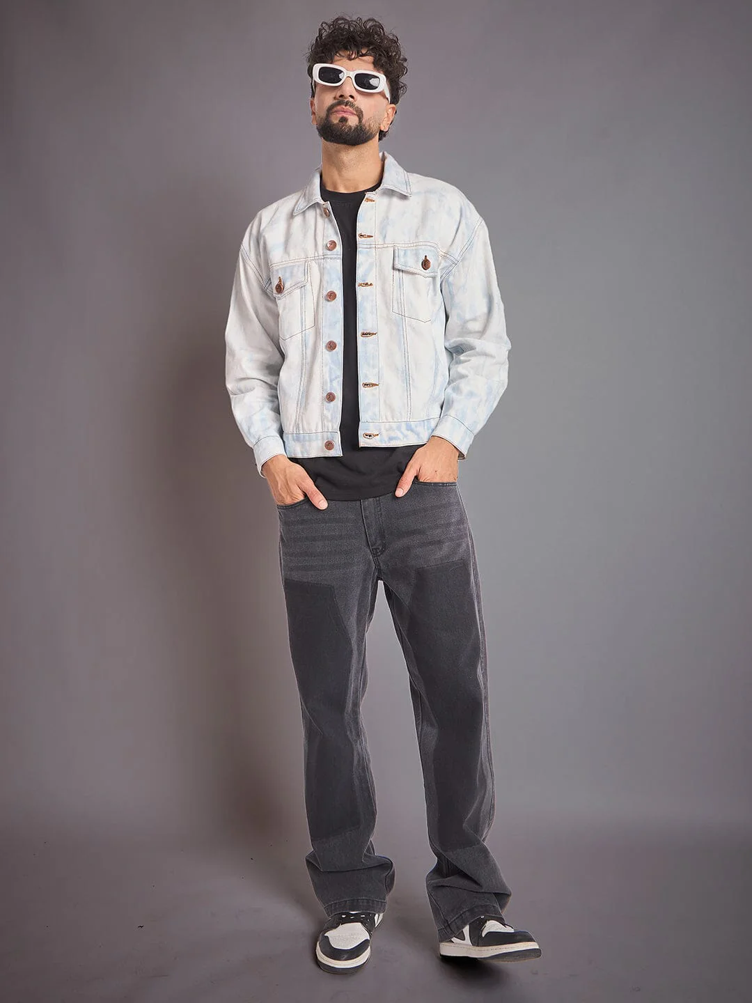 White Vintage Wash Denim Jacket features cotton denim with a vintage white-wash finish. It offers an oversized fit, button closure, and a spread collar for a classic look.